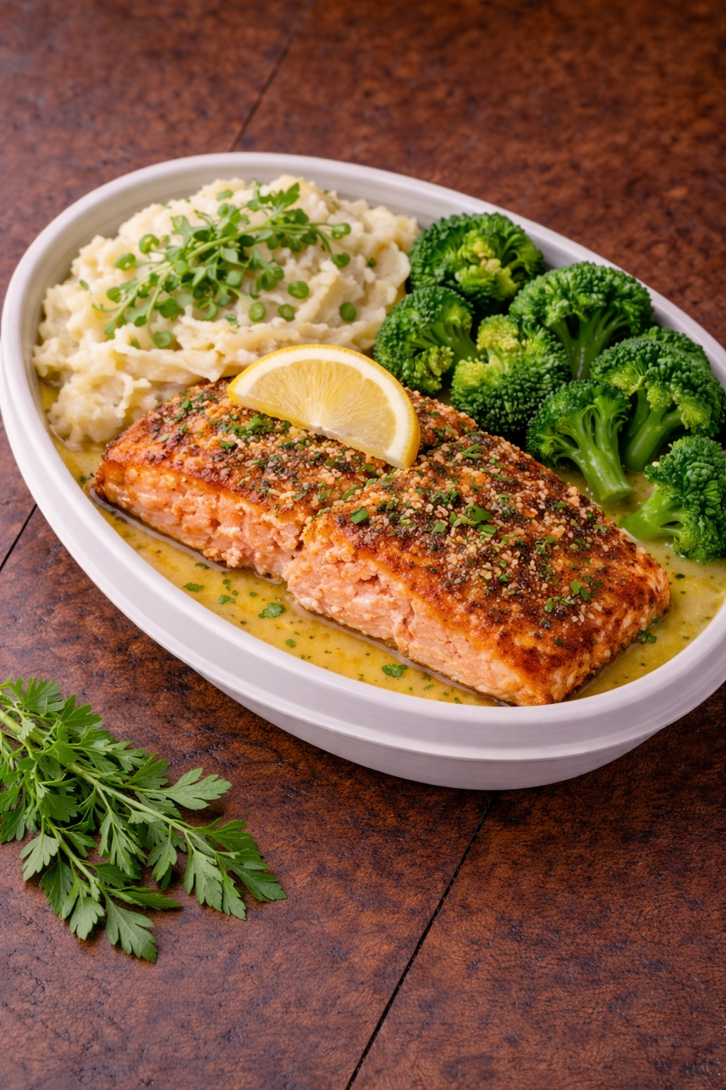 Served with garlic herb mashed potatoes, homemade lemon butter sauce & broccoli