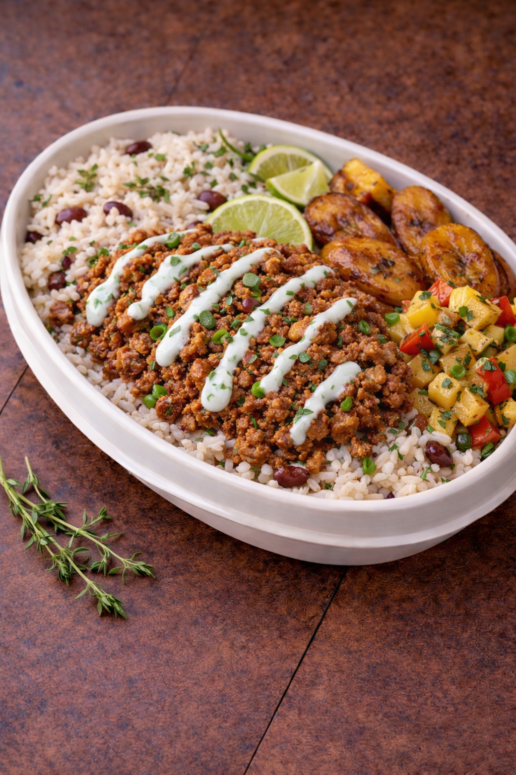 Spiced ground turkey sautéed with scallions, thyme, and warm Caribbean jerk spices, served over coconut rice and peas with roasted sweet plantains and charred pineapple salsa. Finished with a cooling lime yogurt drizzle for balance