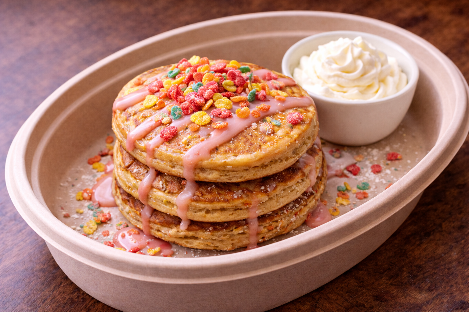 Fluffy, protein-packed pancakes infused with the nostalgic sweetness of cereal milk. Each bite delivers that classic childhood flavor while fueling your body with high-quality protein. Topped with a light drizzle of strawberry glaze and crunchy cereal pieces, these pancakes are the perfect balance of fun and functional—making breakfast feel like a treat you’ll actually feel good about