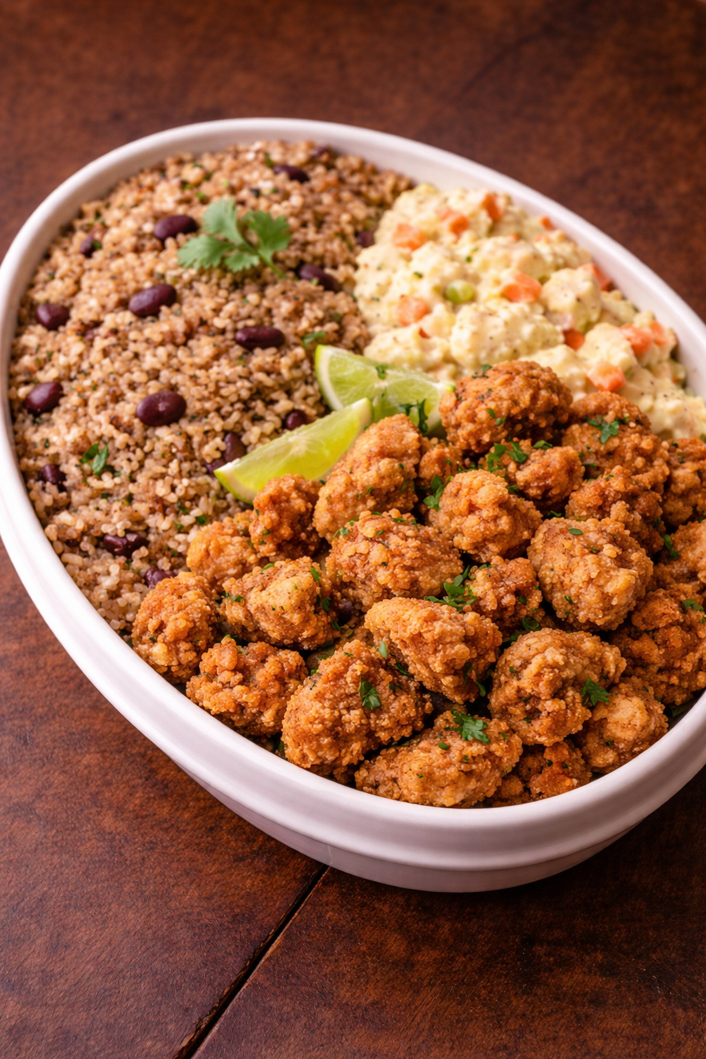 GF – Crispy golden chicken bites marinated in bold Dominican spices, paired with savory moro rice simmered with beans and herbs for rich, comforting flavor. Served alongside a creamy ensalada rusa made with tender potatoes, carrots, and a touch of mayo.