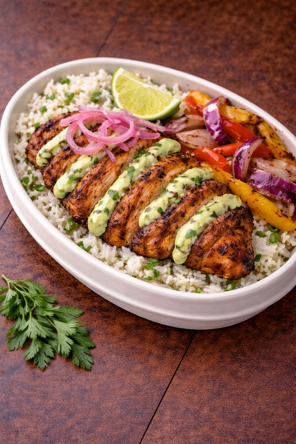 Grilled achiote-marinated chicken breast finished with bright citrus and warm spices, served over coconut-lime jasmine rice with charred sweet peppers and blistered onions. Finished with avocado herb crema and pickled red onion