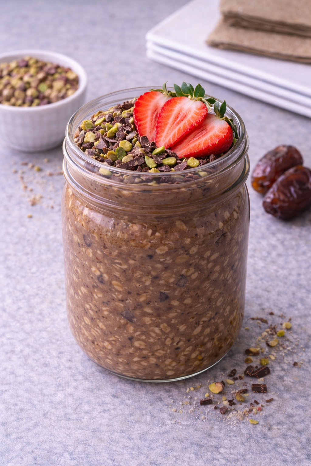 Inspired by the rich, indulgent flavors of Dubai, these overnight oats are crafted with rolled oats, almond milk, and premium chocolate protein powder for a creamy, nutrient-packed base. Blended with dark cocoa, a touch of espresso, and a hint of cardamom. Lightly sweetened with dates and topped with crushed pistachios and shaved dark chocolate