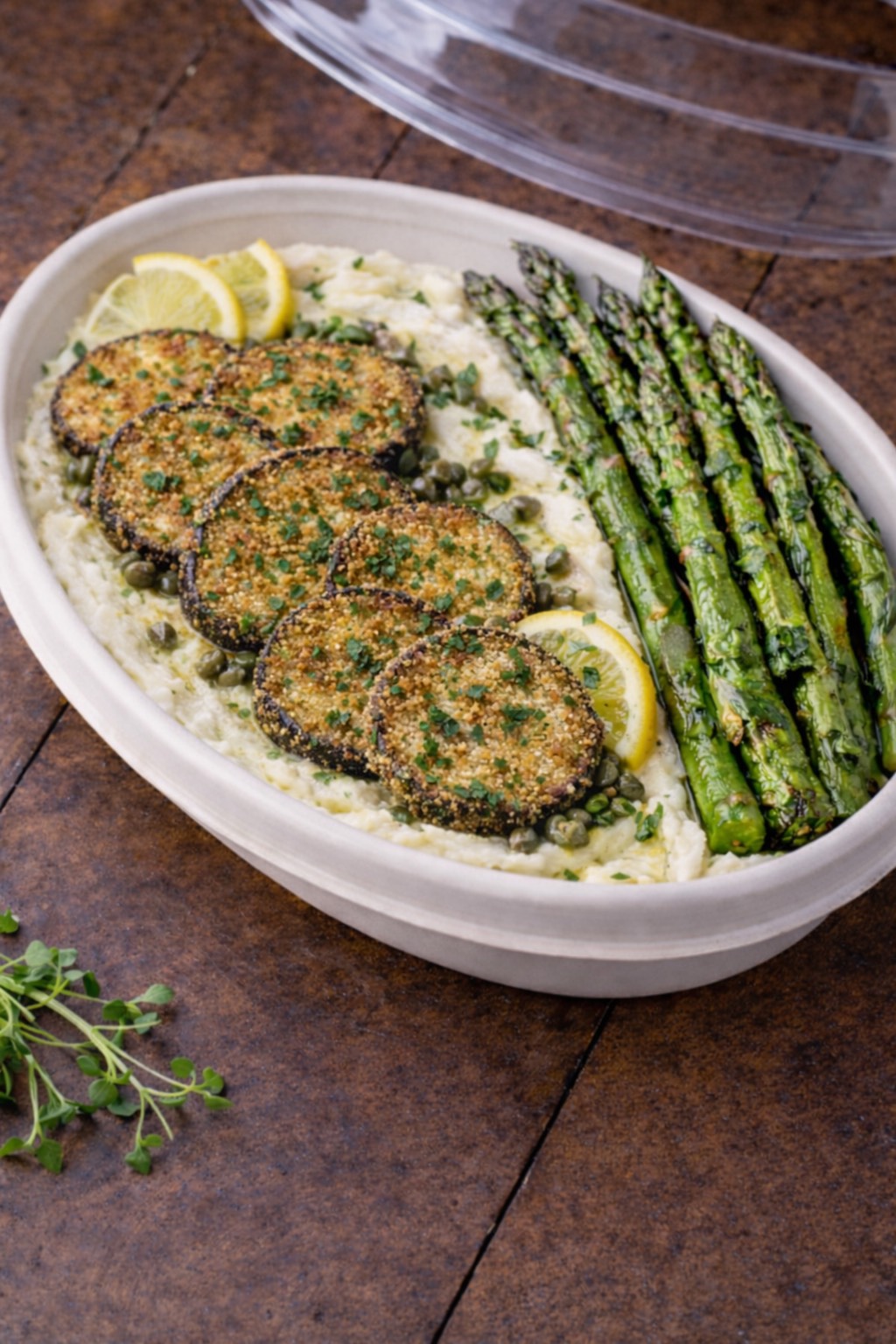 Pan-seared eggplant until golden, finished in a bright lemon-caper sauce Served over silky, whipped mashed potatoes and paired with tender roasted asparagus