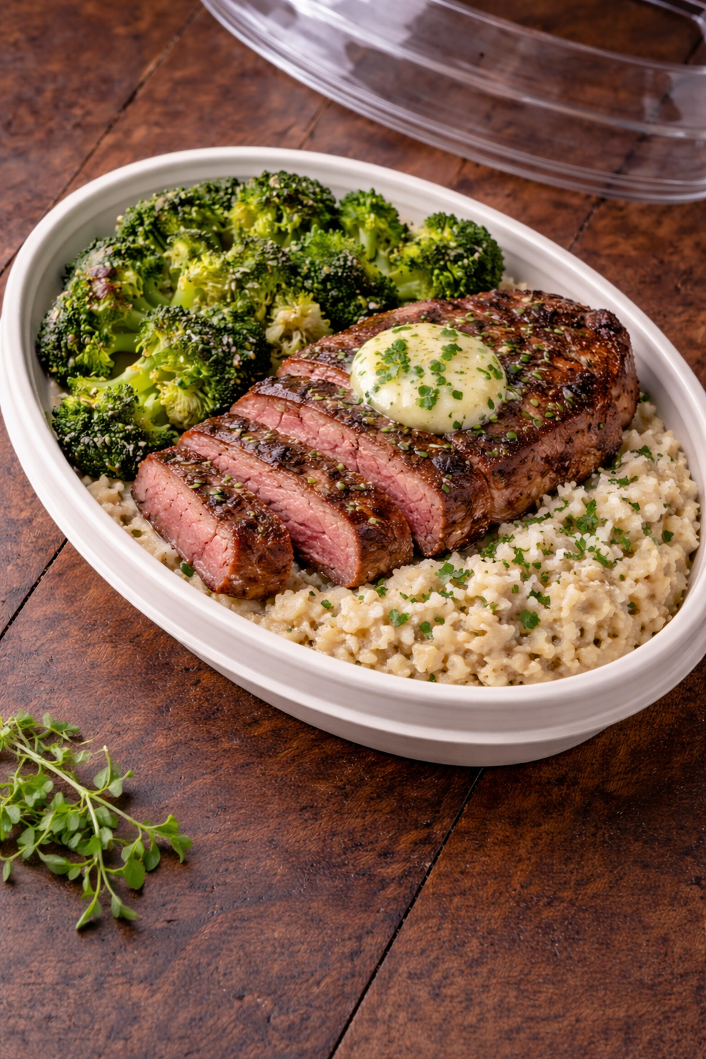 Perfectly seared sirloin steak finished with a house-made whipped herbed butter, served atop a creamy truffle-infused risotto and paired with tender roasted broccoli.