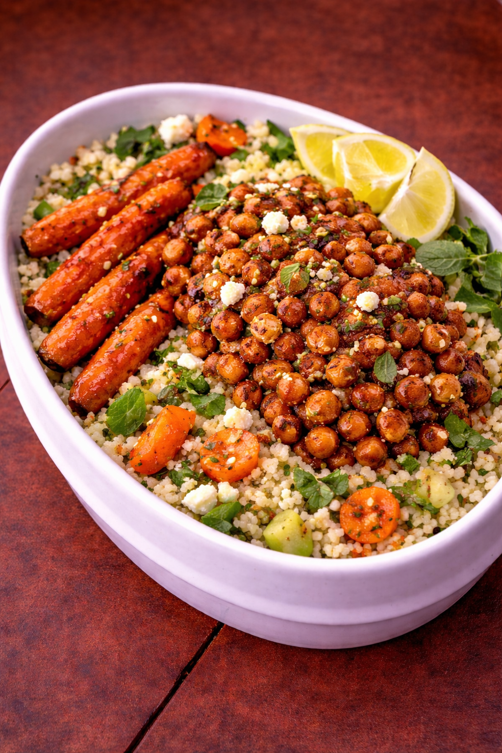 garbanzo beans, olive oil, garlic, harissa, honey, couscous, carrots, mint, parsley, lemon, sea salt, black pepper