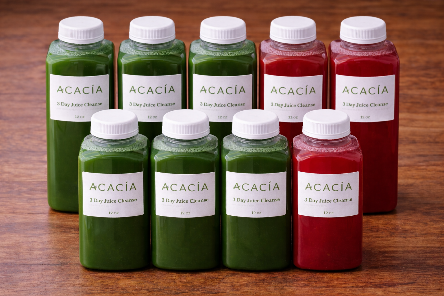 For each of the three days consume one red juice for breakfast, and one green juice for both lunch and dinner. Hydrate well throughout the day and sip slowly for best results.