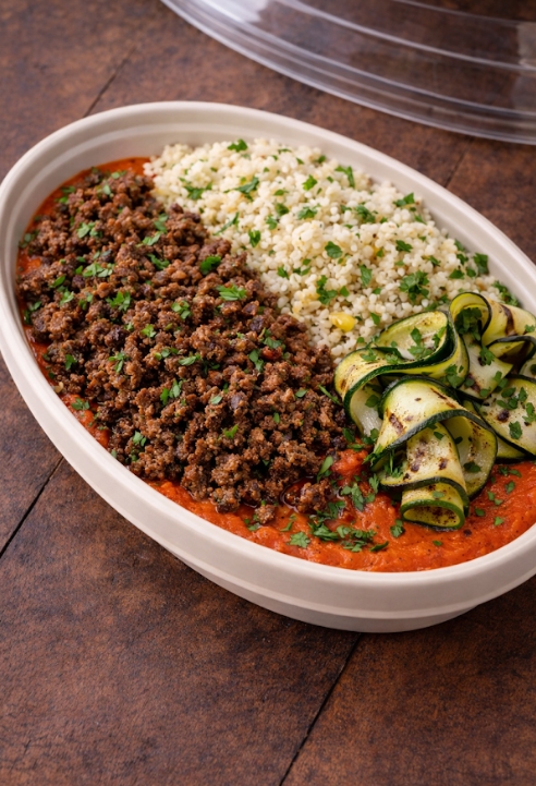 plant based beef, red bell peppers, garlic, onion, tomato paste, couscous zucchini, parsley, cumin, paprika, coriander, extra virgin olive oil, salt, black pepper.