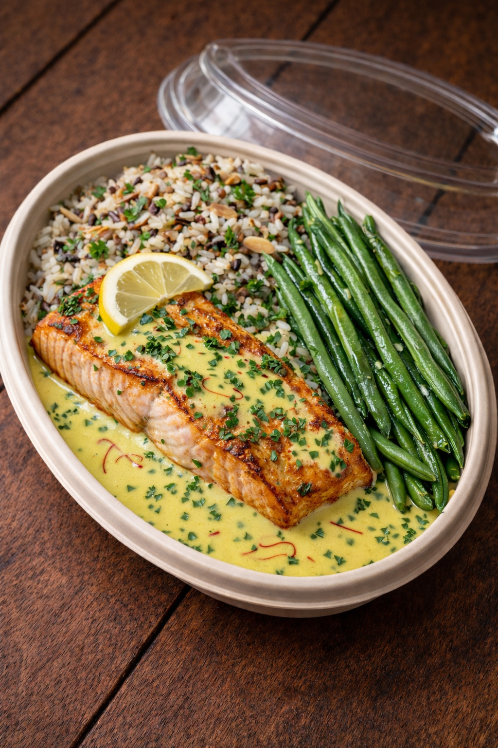 Salmon, olive oil, kosher salt, black pepper, garlic, shallots, unsalted butter, heavy cream, saffron threads, fresh lemon juice, lemon zest, fresh thyme, wild rice blend, vegetable stock, bay leaf, haricots verts (green beans), extra virgin olive oil, sea salt, cracked black pepper, fresh parsley.