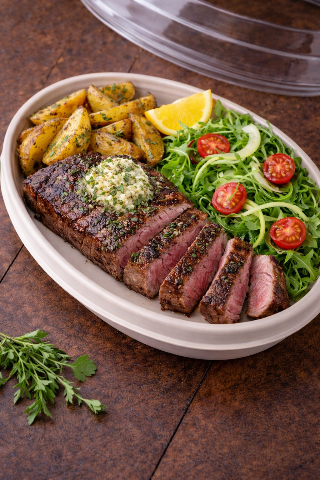 Perfectly seared sirloin finished with a rosemary garlic butter served alongside crispy smashed baby potatoes roasted in olive oil and sea salt. Paired with a bright lemon-dressed arugula salad, shaved fennel, and cherry tomatoes