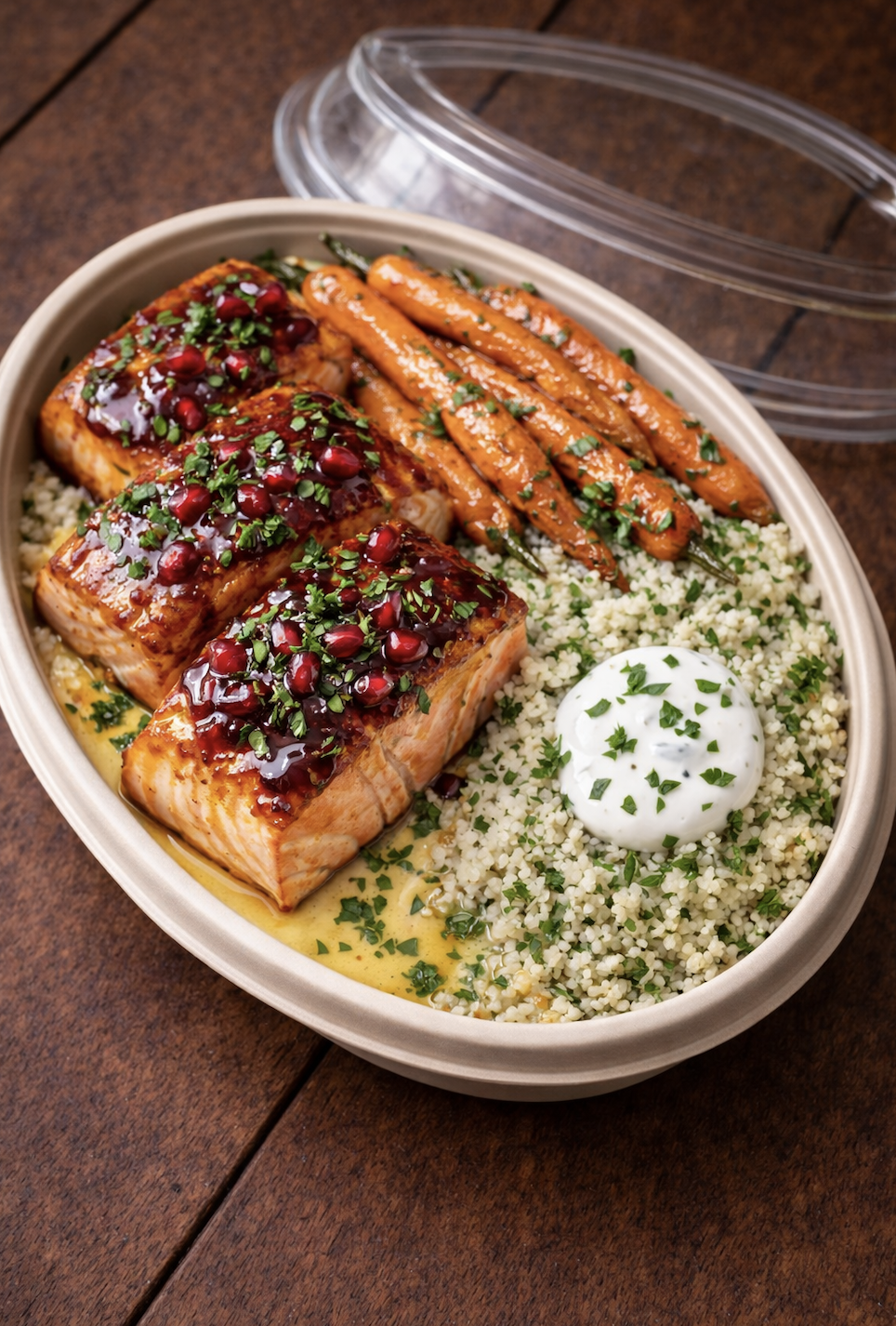 Salmon lacquered in a glossy pomegranate reduction Served alongside tender honey-roasted carrots and fluffy herbed couscous infused with olive oil and fresh herbs, finished with a side of garlic-mint yogurt