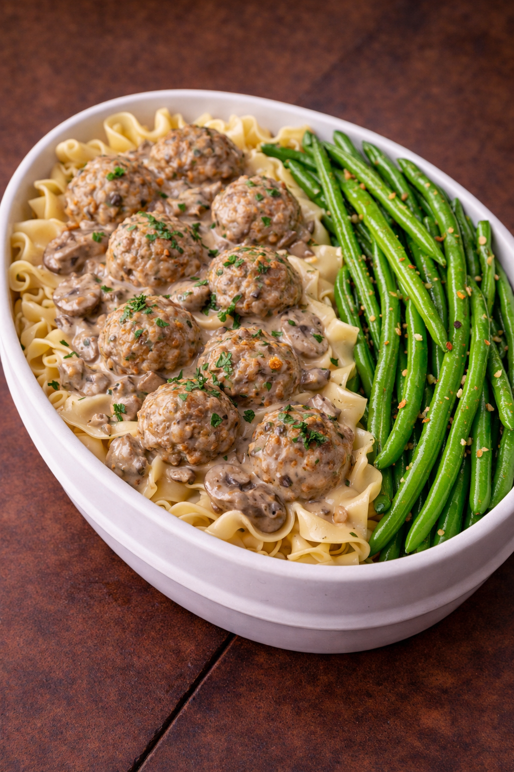 Delicately seasoned turkey meatballs, gently seared and finished in a mushroom velouté sauce enriched with caramelized shallots, roasted garlic, and a touch of cultured cream. Served over tender egg noodles and green beans.
