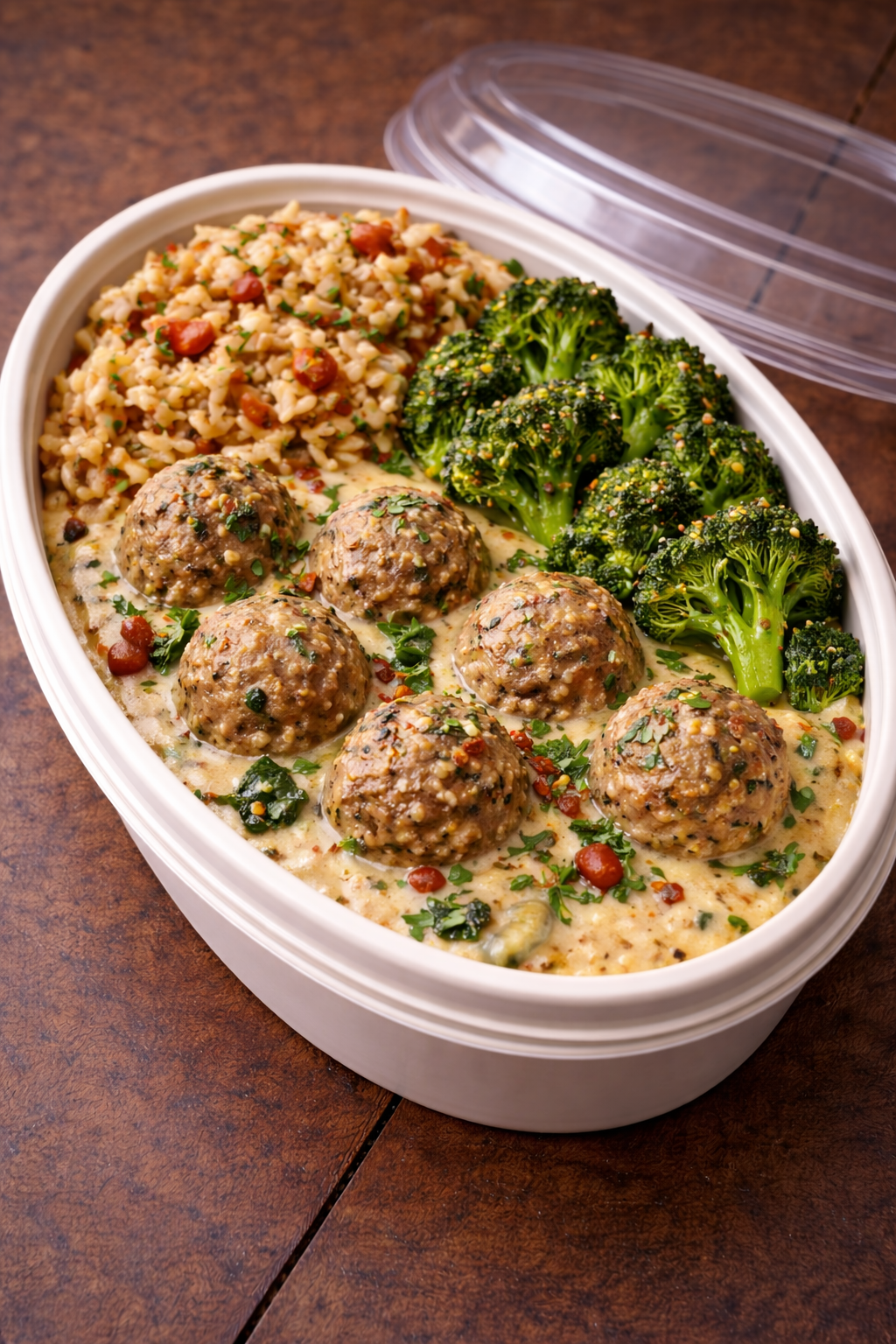 Tender plant based meatballs simmered in a garlic dairy free cream sauce, served alongside sun-dried tomato orzo and roasted broccoli