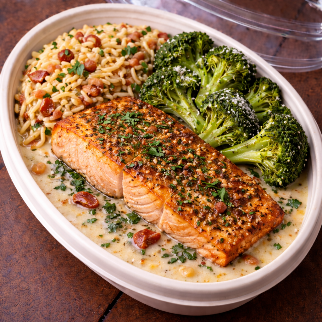 salmon, garlic, onion, Italian herbs, sea salt, avocado oil, sun-dried tomatoes, orzo pasta, unsweetened cream garlic, extra virgin olive oil, broccoli florets.
